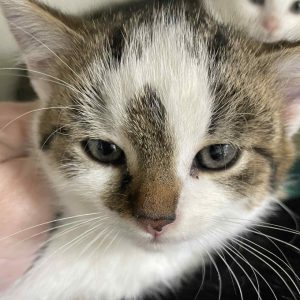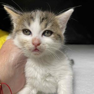 Koťátko, které patří do vánočního balíčku koťat vyhozených ve Vrátkově v papírové krabici. Naštěstí je