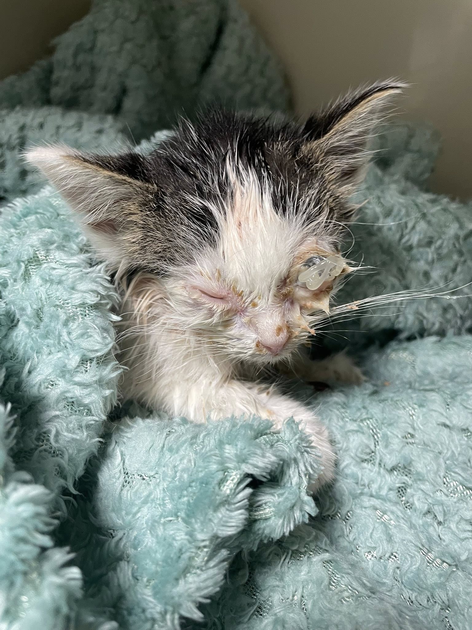 Toto koťátko bylo nalezeno v zoufalém zdravotním stavu. Je podvyživené, bolavé a má doslova a do písmene shnilá očička plná hnisu. Váží bohužel jen 400 g, takže v současné době není možné mu v narkóze nechat odstranit zbytky oček. Nezbývá, než léčit a snažit se, aby infekce nezasáhla do dalších oblastí jeho zbědovaného tělíčka. Takže krmíme, opečováváme, mazlíme a děláme vše proto, aby co nejdříve dosáhl doporučené váhy 1,5 kg a mohl podstoupit operaci. Držte maličkému drobečkovi palce, ať vše zvládne na jedničku